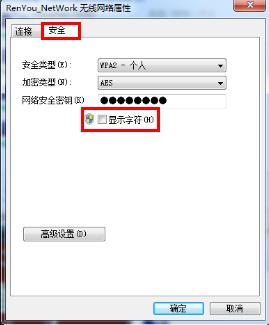 2、在网络属性窗口中,切换到“安全”选项卡,接着我们只需勾选“显示字符”,网络安全密钥即会以明文的当时显示出来,如下图所示: