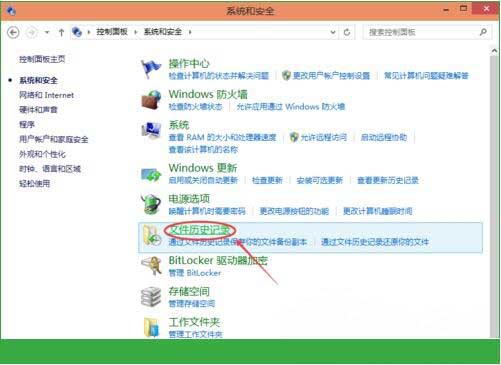 3、点击打开系统和安全窗口,然后在点击文件历史记录,如图所示: