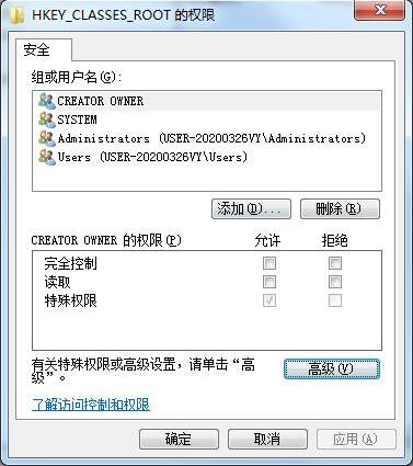 4、在没有创建建值权限的注册表大类上单击右键→选择“权限”,在新弹出的权限设置窗口,点击“高级”;如图所示: