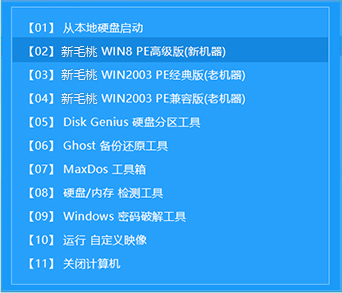 1、将制作好的新毛桃u盘启动盘插入电脑usb接口,进bios设置U盘启动,重启电脑后按开机启动快捷键进入新毛桃主菜单界面,选择“【02】新毛桃win8pe高级版(新机器)”并回车,如图: