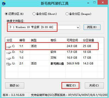 2、先用分区工具做好分区,然后在新毛桃pe装机工具当中选择win10镜像文件安装到c盘当中,点击确定,如图所示: