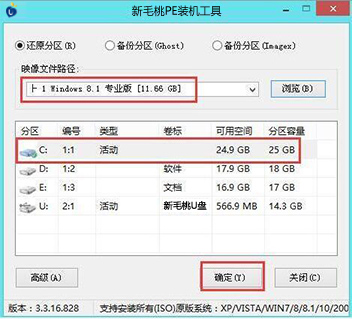 2、在新毛桃pe装机工具中选择win8镜像安装在c盘中,点击确定,如图所示: