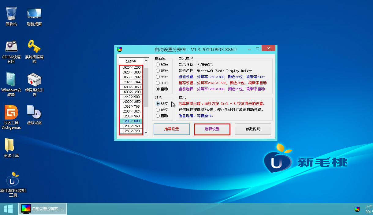 3、打开自动设置分辨率工具页面后,将鼠标移至工具页面并点击以免执行默认设置,然后我们在页面左侧分辨率列表中选中需要调整的分辨率指数,也可以单击选择刷新率和颜色,然后点击“选择设置”按钮,屏幕便会做出相应调整。如果不合适,只需重新打开工具列表进行设置即可,如下图所示: