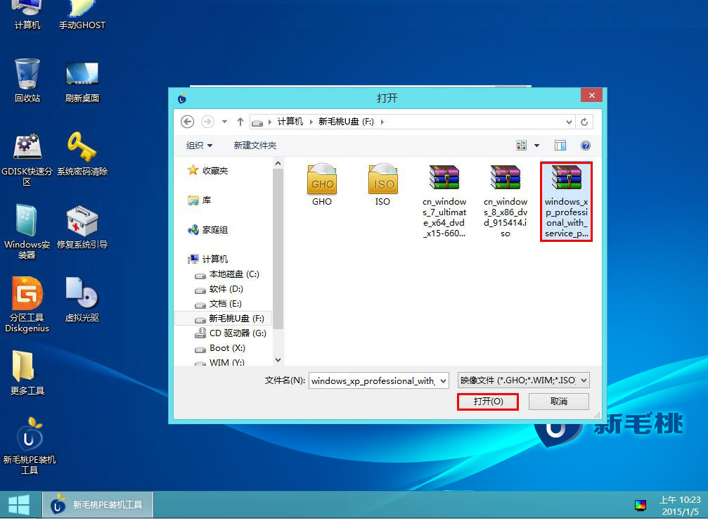 2、随后在pe系统桌面上,双击运行新毛桃PE装机工具,工具便会自动扫描系统中的系统安装包并将其显示在映像文件路径下。若没有工具没有识别番茄花园ghost xp系统安装包,我们可以点击“打开”按钮,如下图所示: