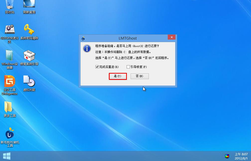 5、随后会弹出一个询问框提示用户将执行还原操作,我们点击“是”继续,如下图所示: